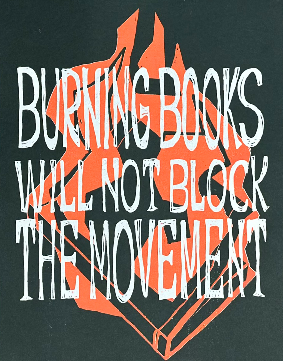 Screenprinted with UV reactive ink on deep green paper, this protest poster burns under blacklight.